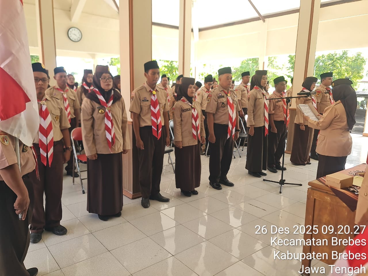 Brebes, jumat 26 Desember 2025, bertempat di aula Sanggar Bhakti Pramuka Kwarcab Brebes, sebanyak 69 peserta Kursur Mahir Dasar dan Mahir Lanjutan yang telah menyelesaikan kegiatan Narakarya dikukuhkan menjadi Pembina, serta 8 orang pembina yang telah mengikuti Kursus Pelatih dan telah melaksanakan kegiatan Naratama dikukuhkan menjadi Pelatih.