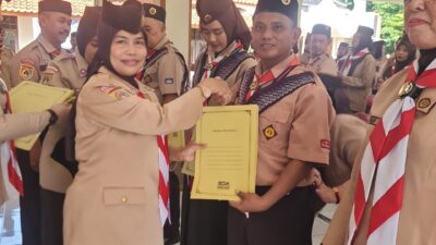 Pengukuhan dilakukan oleh Ka. Kwarcab Brebes, yang diwakili oleh Sekretaris Cabang Kwarcab Brebes, kak Dr. Caridah, M.Pd.
