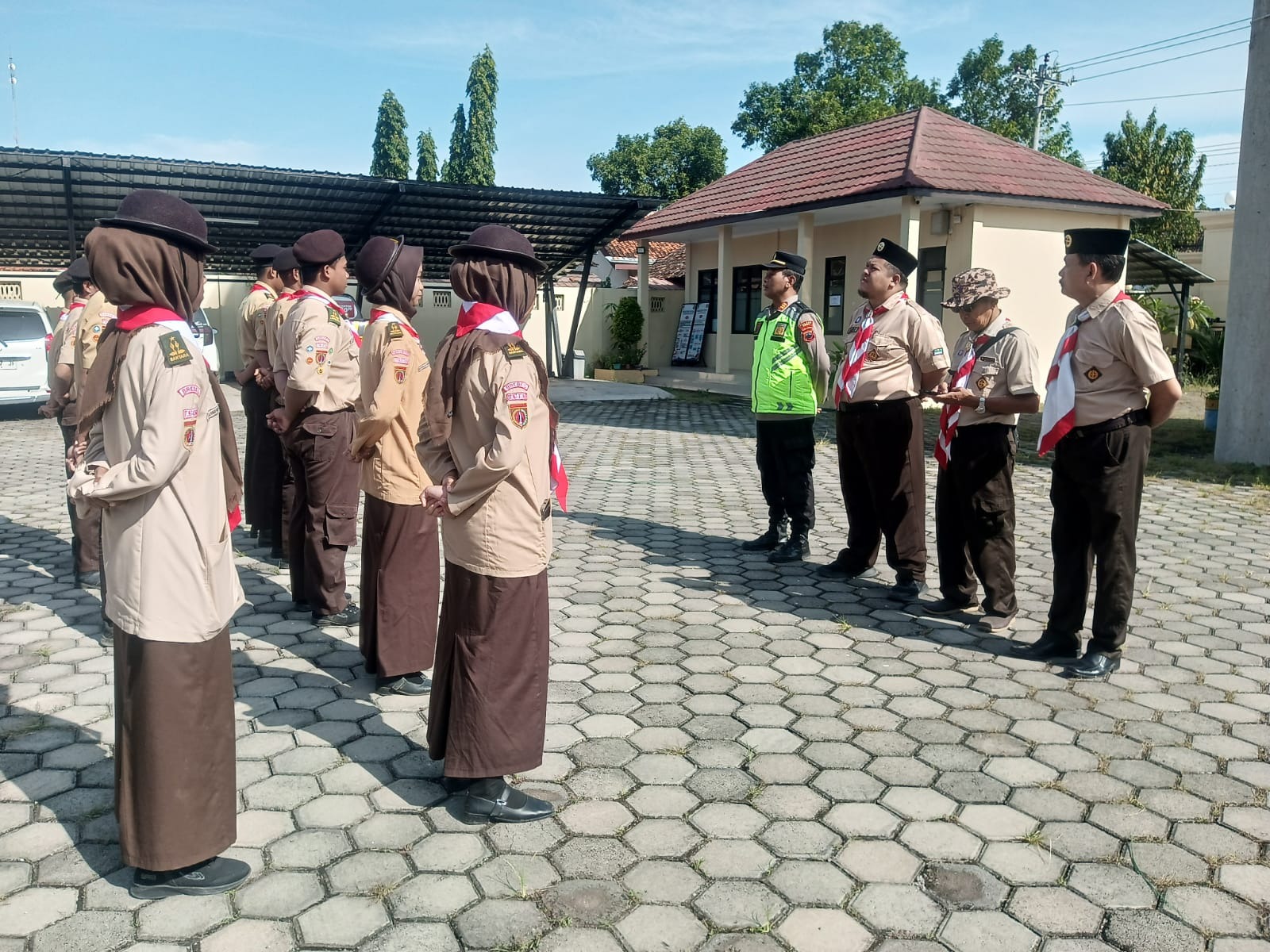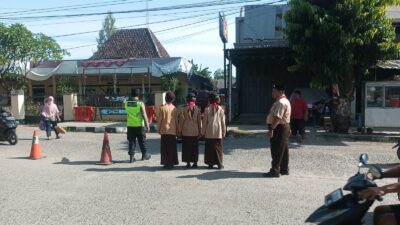 Di depan Polsek Jatibarang, anggota Pramuka membantu aparat dalam mengatur arus kendaraan yang keluar masuk serta memastikan tidak terjadi kemacetan. Kehadiran mereka juga memberikan dukungan tambahan bagi petugas kepolisian dalam menjaga ketertiban di sekitar area tersebut.